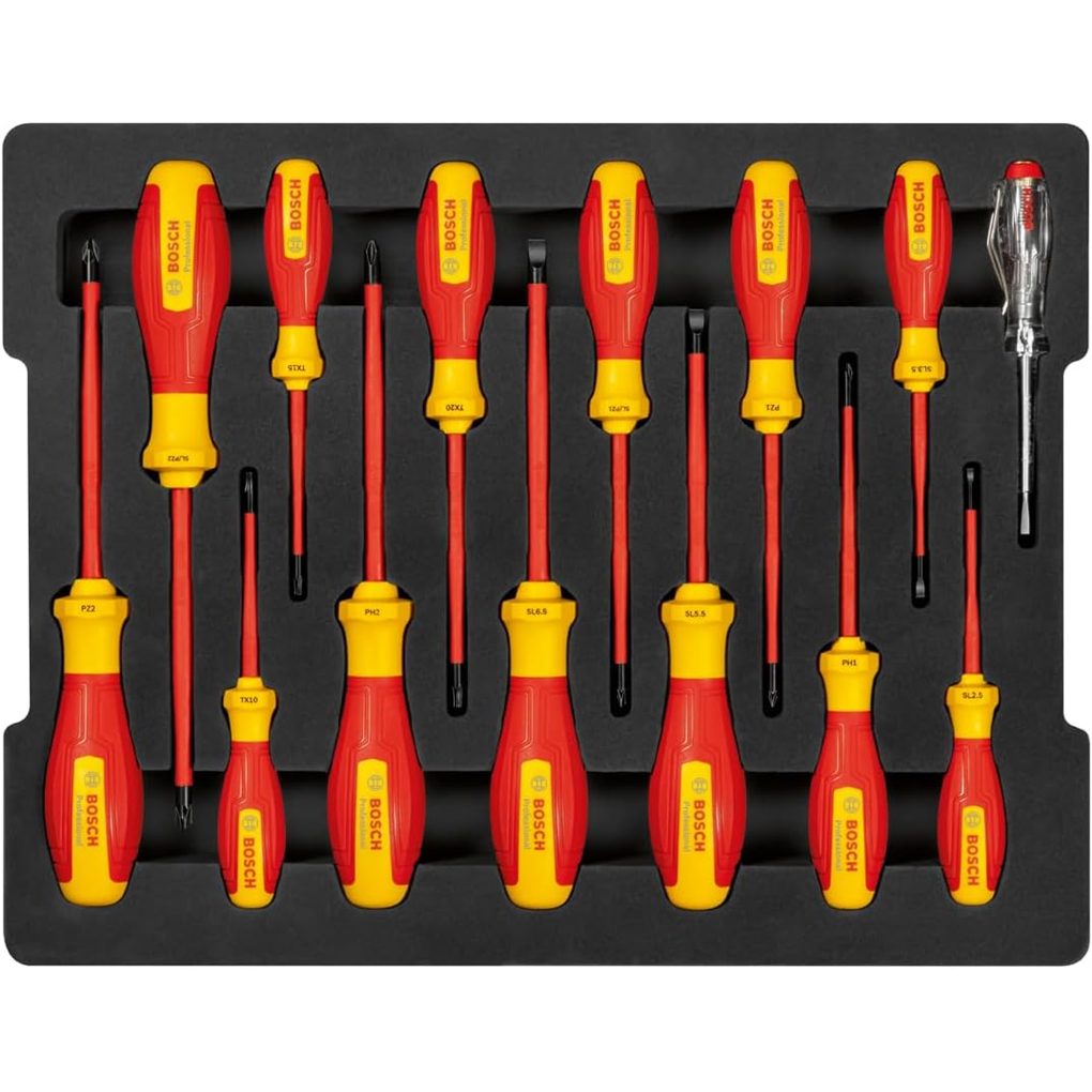 Bộ Tua Vít Cách Điện VDE 14 Chi Tiết Bosch 1600A02NF9 là một dụng cụ cầm tay được sử dụng để siết chặt hoặc gỡ bỏ ốc vít trên bề mặt vật liệu nào đó. Công cụ này có cấu tạo bao gồm tay cầm và một trục, cùng với đầu vít để vặn ốc vít. Tua vít thường được làm bằng thép cứng để chống uốn hoặc xoắn hiệu quả
