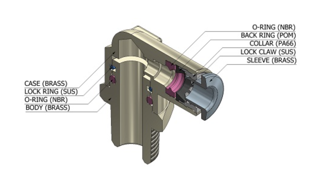 - Kẹp giữ (Lock Claw / Lock Ring): Bằng thép không gỉ (SUS), đảm bảo giữ ống chắc chắn và bền bỉ theo thời gian.