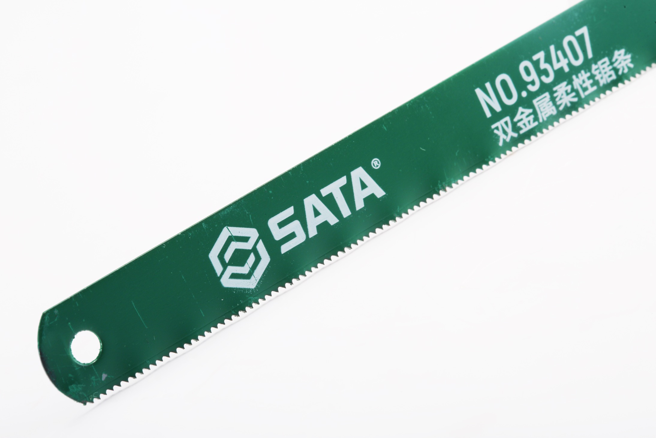 - In ấn sắc sảo: Dòng chữ “32 TPI”, “Bi-Metal”, logo “SATA 93408” in lụa màu bạc bám rất chắc trên nền sơn xanh.