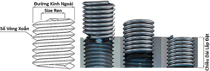 - Tính đàn hồi hướng tâm: Khi ở trạng thái tự do, đường kính lò xo lớn hơn lỗ taro. Khi lắp vào, nó co lại và tạo ra lực bung liên tục, ép chặt vào thành lỗ để đảm bảo không bị xoay ngược khi tháo vít.