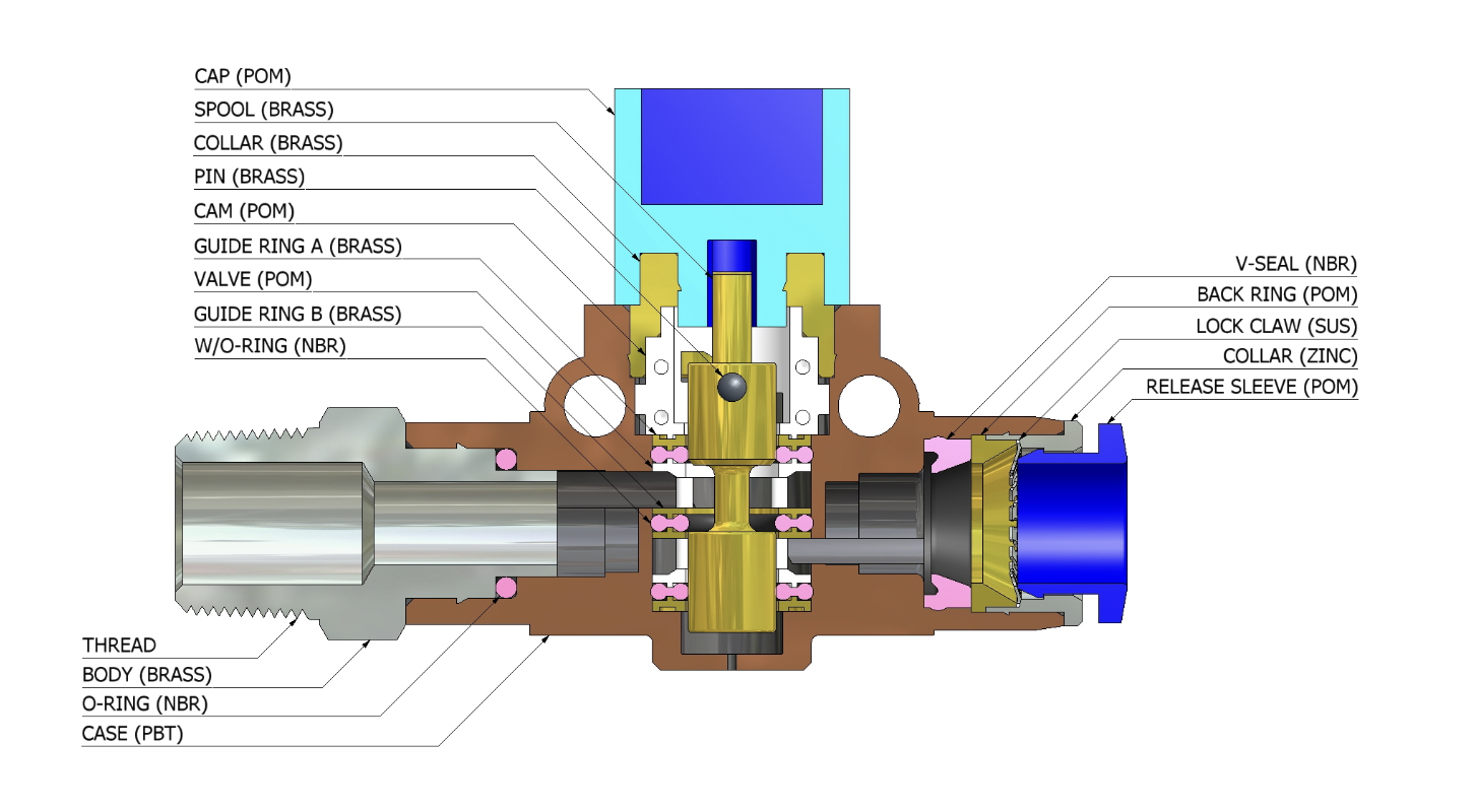 - Vật liệu bền bỉ: Được chế tạo từ đồng thau, POM, NBR, SUS và PBT, mang lại tuổi thọ lâu dài và khả năng chống ăn mòn.
