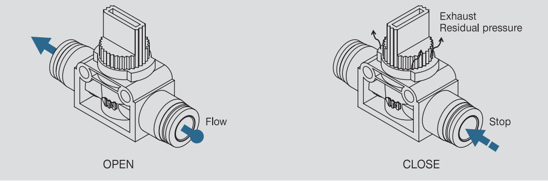 - Để đóng van và ngắt dòng khí, xoay núm điều khiển đến vị trí “CLOSE”. Khi đóng, van sẽ tự động xả áp suất dư ở phía đầu ra.
