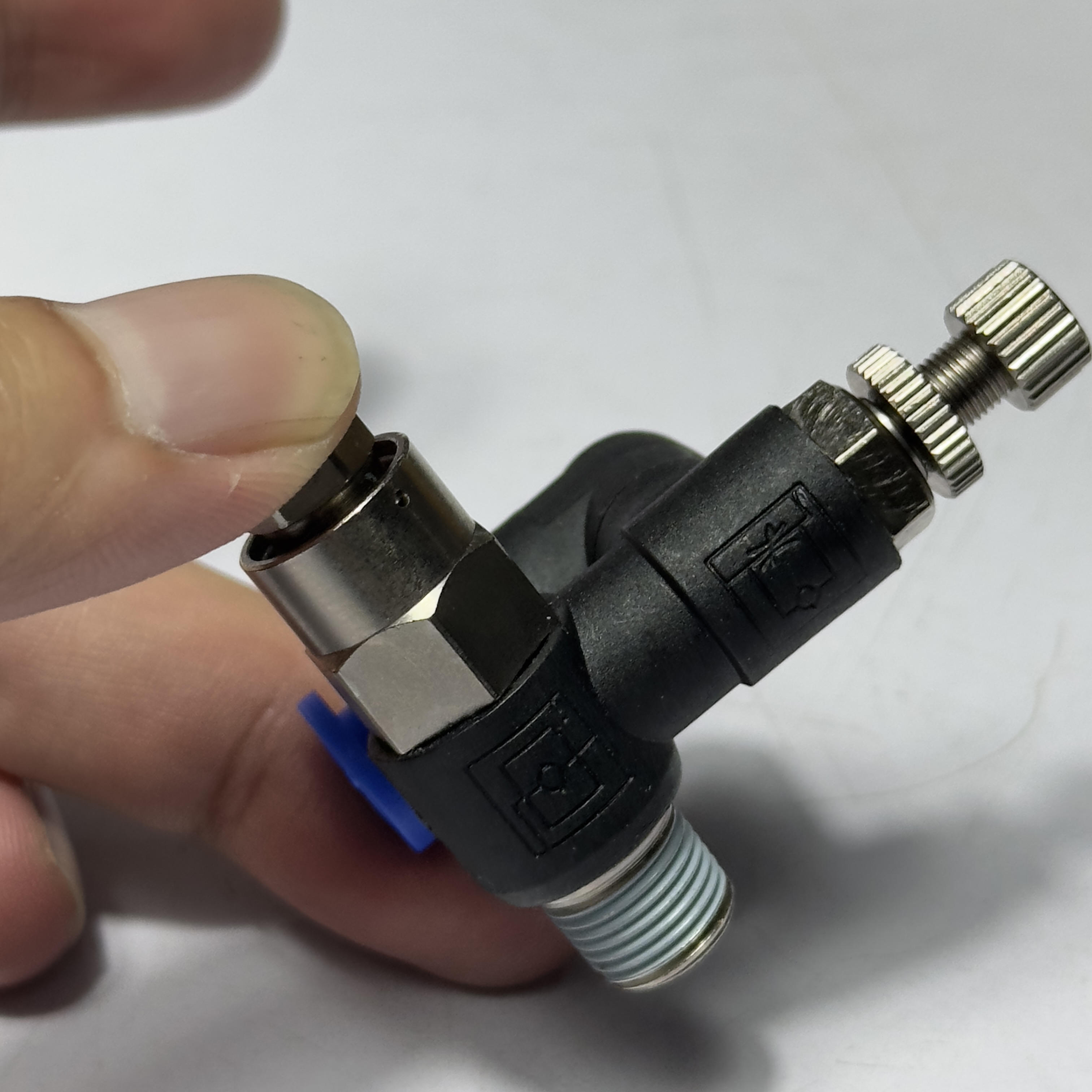 - Xoay núm điều chỉnh (needle) để tăng hoặc giảm lưu lượng khí, từ đó điều chỉnh tốc độ của xy lanh. Xoay theo chiều kim đồng hồ để giảm lưu lượng (tăng tốc độ) và ngược chiều kim đồng hồ để tăng lưu lượng (giảm tốc độ).