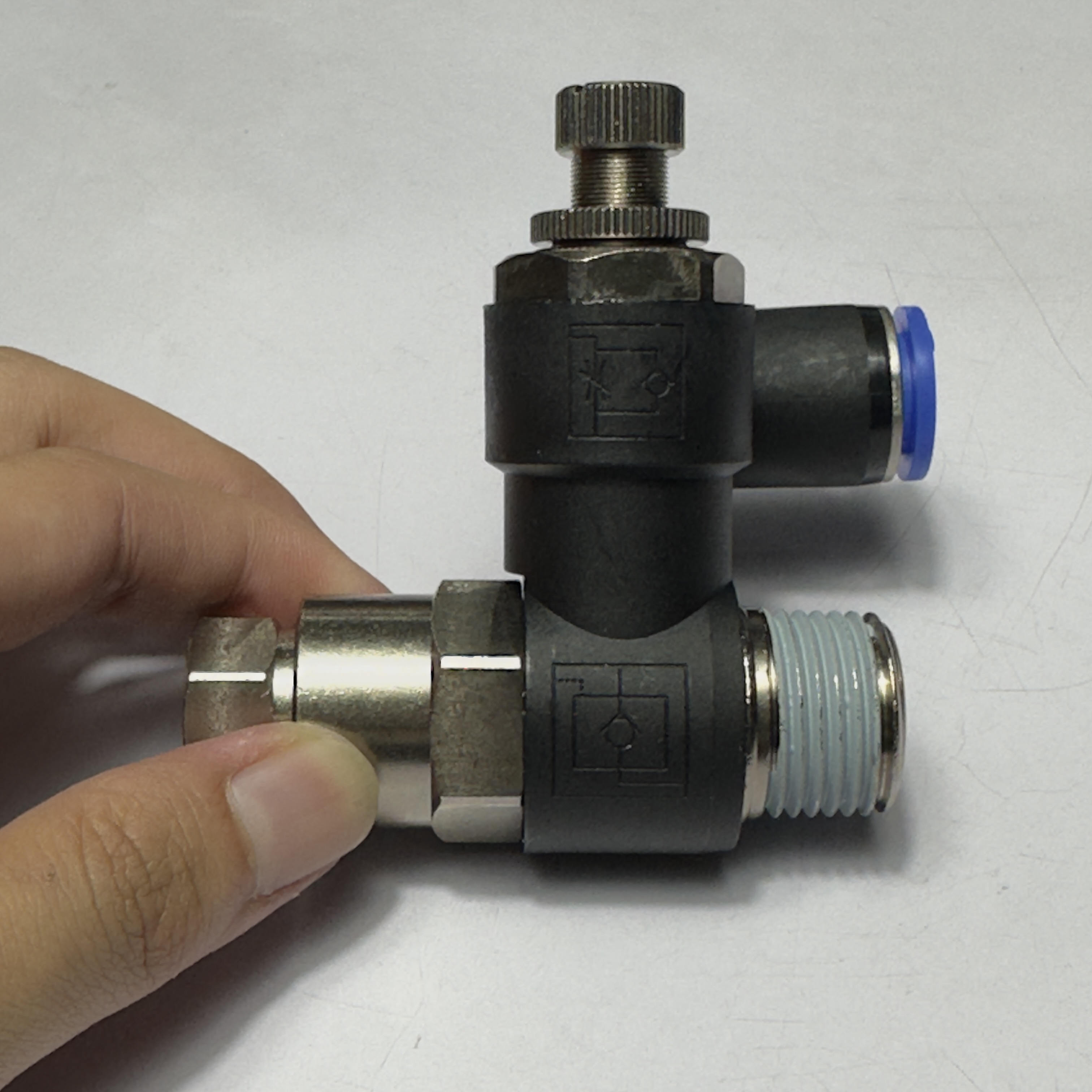 - Xoay núm điều chỉnh (needle) để tăng hoặc giảm lưu lượng khí, từ đó điều chỉnh tốc độ của xy lanh. Xoay theo chiều kim đồng hồ để giảm lưu lượng (tăng tốc độ) và ngược chiều kim đồng hồ để tăng lưu lượng (giảm tốc độ).